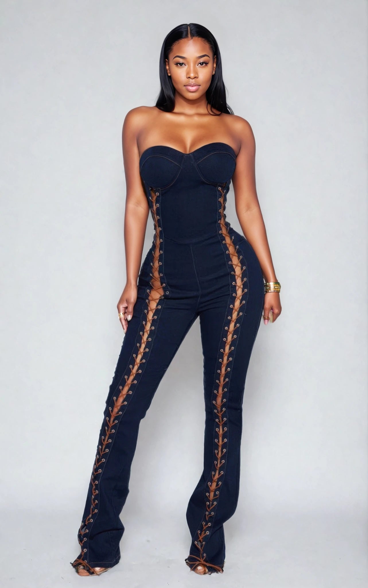 Turn heads with our Lace-Up Detail Denim Jumpsuit, a striking piece that combines bold design with ultimate comfort. Perfect for those who love making a statement, this jumpsuit is designed to flatter your figure and elevate your style.