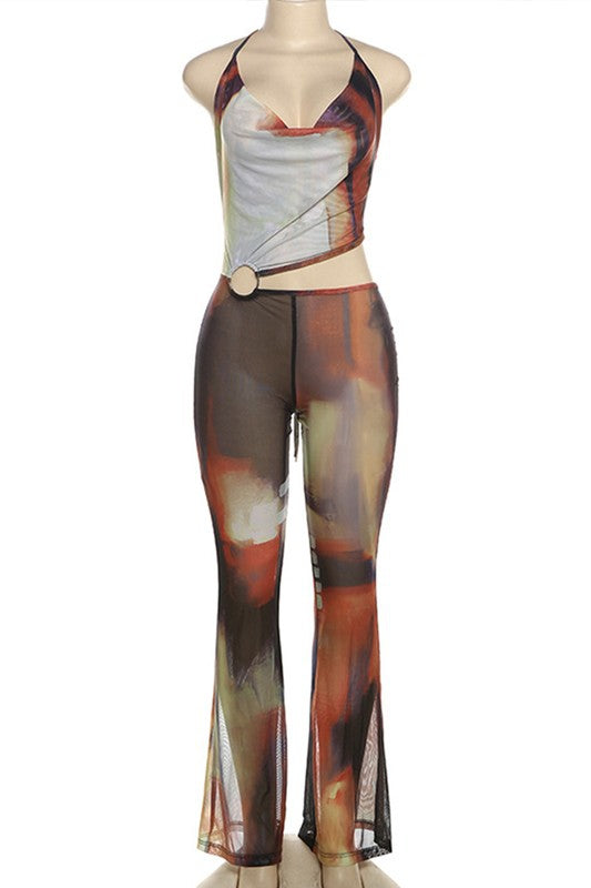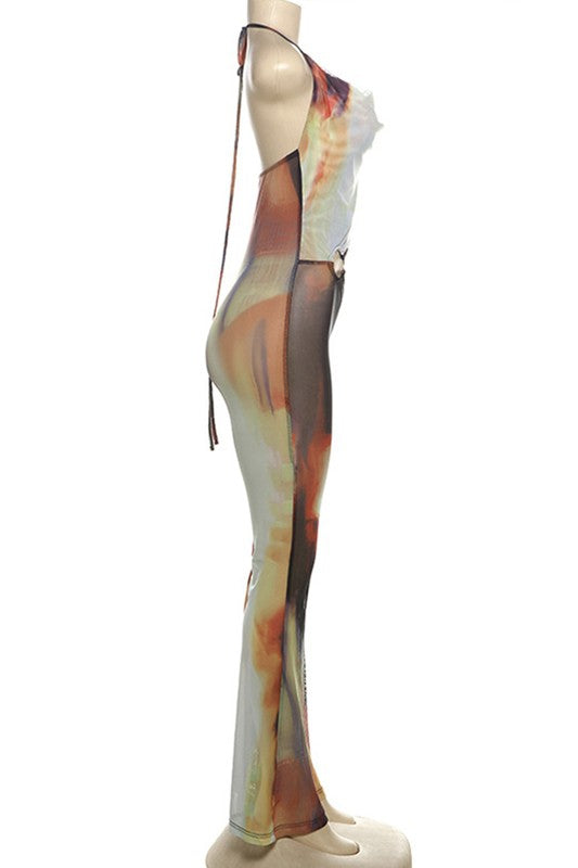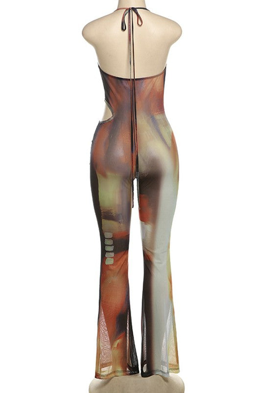 Spice it up with this flattering jumpsuit. The beautiful draping neckline, paired with unique cutouts and tie up features combine to make a show stopping look.